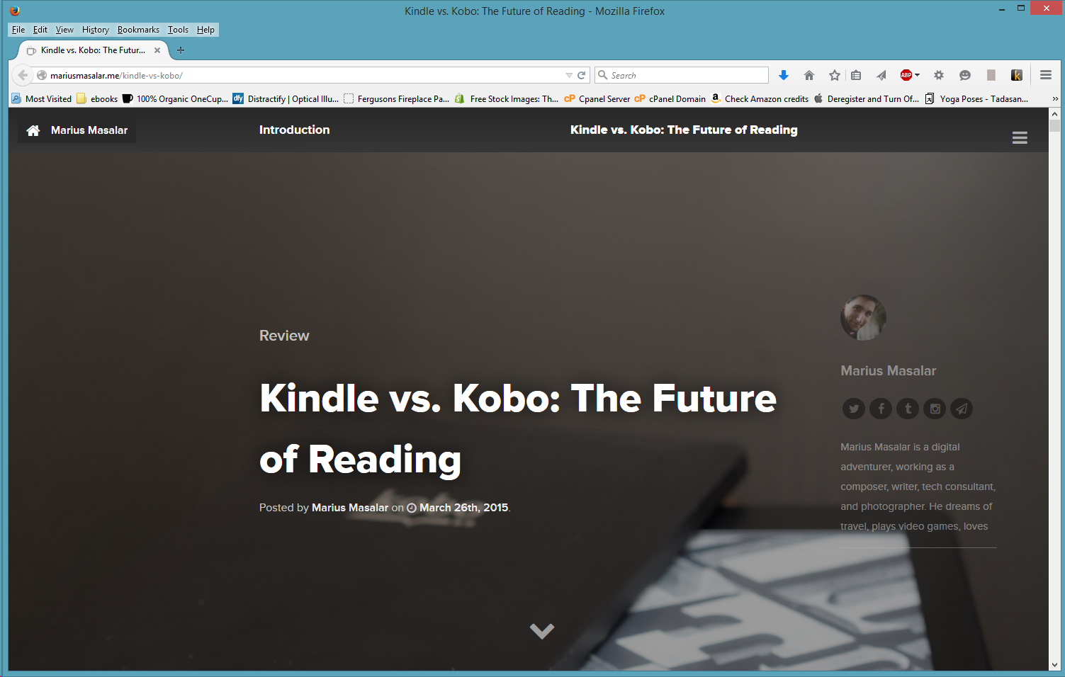 In general, it is in line my conclusions (being an owner of H2O and Paperwhite as well). Kobo needs *some* work on speed AND definitely needs to provide Much better cloud services (open up the ecosystem for third party content), although this might interfere with their business model (because their store is atrocious to search in, so they’d need to change that as well). Conversely, Amazon needs to improve their text engine and perhaps generally open up their ecosystem a bit more to third party content. If highlights and annotations of personal documents were available on kindle.com, there’d be no reason not to use the service (and thus the device and store as well). Having said that, I really like that the H2O gives you the option of an expanded view of your annotations plus notes. Since I use Mac and iPad for work I have found that it actually helps to keep copies of my books in iBooks and just review all my highlights on the Kobo and add those that were actually important (along with expanded notes) to my iBooks copy. In my opinion, a workflow superior to just dumping the myclippings file in clippings.io and never looking at the stuff again (I do still dump the file but proceed in the same way as with Kobo highlights from the reader). Also, did you know that the Kobo software has a option that allows you to export individual txt files for annotations (must be enabled by a simple entry in a user settings file on the device, not completely trivial but not really hard to do either). Pocket too is a great plus and one of the main reasons for using my H2O much more than my Kindle. Those books I have on Amazon I can load on my Kobo very easily, or just read them on the iPad ![]() As for PDFs, well, there’s my iPad. But I disagree with both being crap. I actually found the PDF reader on the Kindle not too bad, considering it gives you and ok text size in horizontal mode and lets you highlight just like in books. That being said, I find it strange that Kobo isn’t so much better in this regard. Their engine supports standard Adobe annotations (try adding highlights and notes to a PDF on the Mac and viewing them on Kobo, it displays everything in the same neat way as in books), it just won’t let you add them. If Kobo could add that, they’d be so far ahead of the curve in terms of standalone features, it would be insane (there’s Koreader of course, but it seems that this is not the kind of reliable piece of software one would like to work with, although it may be fine for emergency cases, and it supports Evernote export of highlights, notes not possible). Like I said, I’m currently a bit of a fan of the H2O, and this has much to do with the fact that reading is just SO PLEASANT on it. It behaves like a paper book in so many ways (down to the minor annoyance that annotations cannot be processed digitally) and seems like the perfect companion for me right now in combination with an iPad. |