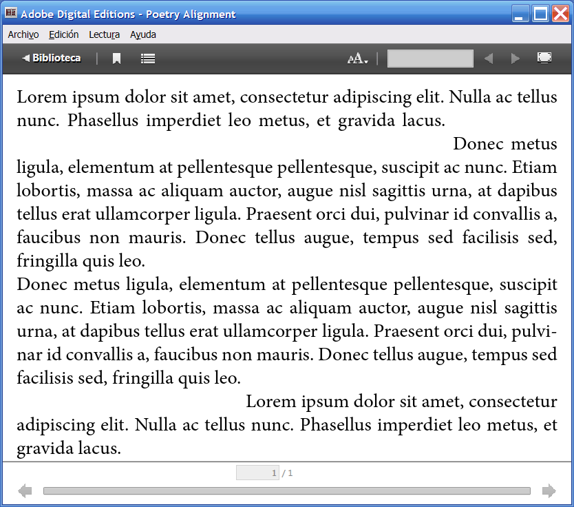I’m facing a problem in a book of poetry and I’m afraid there is no perfect solution in ePub. It’s kinda hard to explain with my limited english, but there are many verses that are aligned with the end of the previous verse. See this blurred page (copyrighted stuff, sorry) from the PDF version for example : ![]() I drew the black lines to show that the beginning of a verse must be aligned with the end of the previous one. Is there a way to consistently replicate this kind of formatting? I’m afraid not, for many reasons (for example, users can switch fonts). The closest solution I thought of was to create a style for every strangely aligned verse and tweak the left margin for every one of them... which doesn’t seem like a very good solution, since there are so many. And it probably won’t even be consistent when users change fonts, etc.) The option I proposed to the publisher is to uniformize these strangely aligned verse to a common value (left margin). He doesn’t really like this option, but I don’t exactly see a better one. Am I missing something here? Any ideas? Thanks in advance, Michael |
