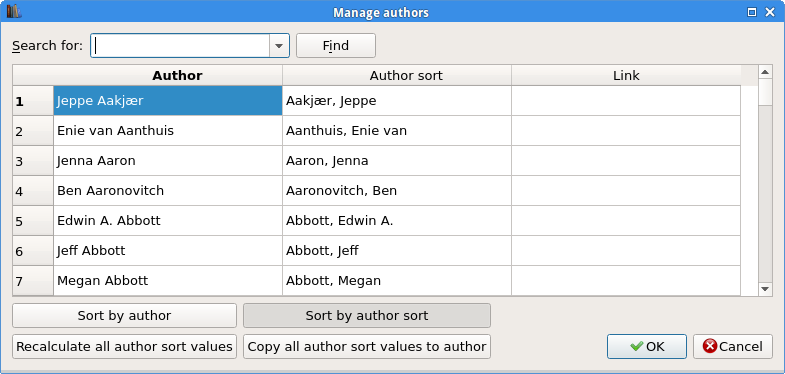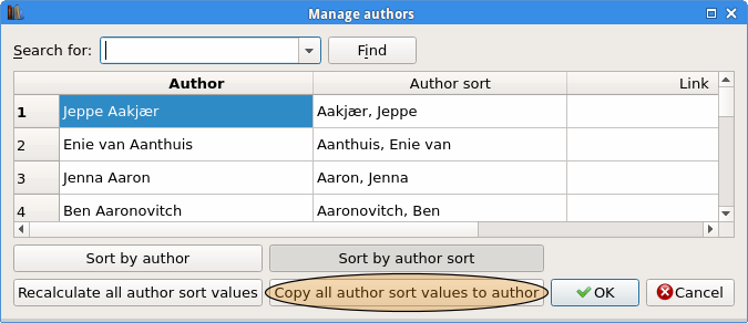 Is that by klicking Copy all author sort values to author? Author sort Aakjær, Jeppe would then get copied to Author as Aakjær, Jeppe? And the same for all of Author sort entries. I do not trust myself to try this out. Why I do ask explicit? That would namely be a disaster - or at least connected for re-conversion with some workload. Quote: