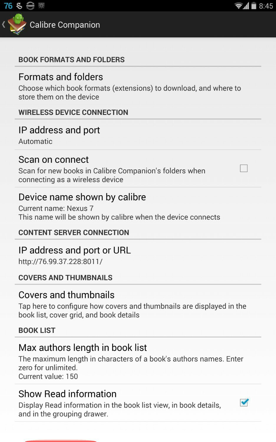 The only thing that I've found a little odd until now is that in the content server mode there's a ''Download All'' button which when touched has no affirmation dialogue box.... it just starts downloading everything straight away. It seemed to me a good idea to add such a dialogue box just to avoid the small chance of accidently downloading your whole Calibre library to your device when you only want a piecemeal selected 10% to be there. I'm new to c.c, so there may be something that I've overlooked in the settings or otherwise...? |