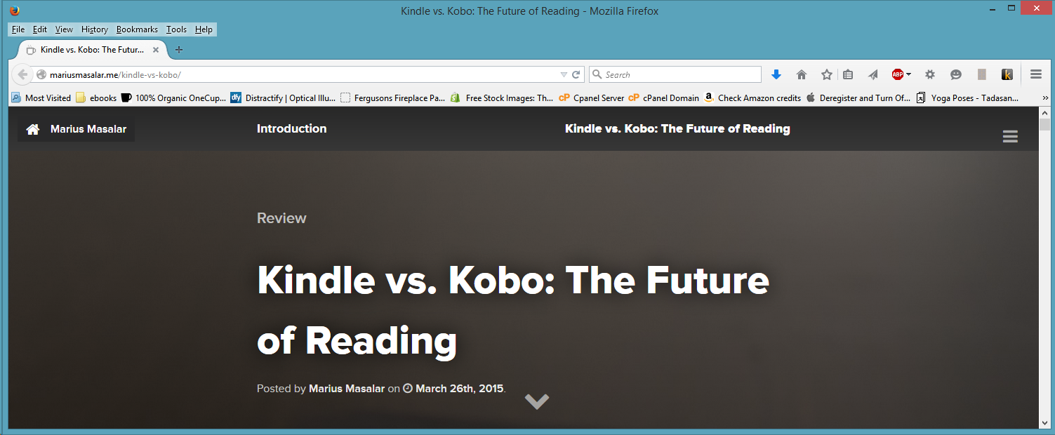 In general, it is in line my conclusions (being an owner of H2O and Paperwhite as well). Kobo needs *some* work on speed AND definitely needs to provide Much better cloud services (open up the ecosystem for third party content), although this might interfere with their business model (because their store is atrocious to search in, so they’d need to change that as well). Conversely, Amazon needs to improve their text engine and perhaps generally open up their ecosystem a bit more to third party content. If highlights and annotations of personal documents were available on kindle.com, there’d be no reason not to use the service (and thus the device and store as well). Having said that, I really like that the H2O gives you the option of an expanded view of your annotations plus notes. Since I use Mac and iPad for work I have found that it actually helps to keep copies of my books in iBooks and just review all my highlights on the Kobo and add those that were actually important (along with expanded notes) to my iBooks copy. In my opinion, a workflow superior to just dumping the myclippings file in clippings.io and never looking at the stuff again (I do still dump the file but proceed in the same way as with Kobo highlights from the reader). Also, did you know that the Kobo software has a option that allows you to export individual txt files for annotations (must be enabled by a simple entry in a user settings file on the device, not completely trivial but not really hard to do either). Pocket too is a great plus and one of the main reasons for using my H2O much more than my Kindle. Those books I have on Amazon I can load on my Kobo very easily, or just read them on the iPad ![]() As for PDFs, well, there’s my iPad. But I disagree with both being crap. I actually found the PDF reader on the Kindle not too bad, considering it gives you and ok text size in horizontal mode and lets you highlight just like in books. That being said, I find it strange that Kobo isn’t so much better in this regard. Their engine supports standard Adobe annotations (try adding highlights and notes to a PDF on the Mac and viewing them on Kobo, it displays everything in the same neat way as in books), it just won’t let you add them. If Kobo could add that, they’d be so far ahead of the curve in terms of standalone features, it would be insane (there’s Koreader of course, but it seems that this is not the kind of reliable piece of software one would like to work with, although it may be fine for emergency cases, and it supports Evernote export of highlights, notes not possible). Like I said, I’m currently a bit of a fan of the H2O, and this has much to do with the fact that reading is just SO PLEASANT on it. It behaves like a paper book in so many ways (down to the minor annoyance that annotations cannot be processed digitally) and seems like the perfect companion for me right now in combination with an iPad. |