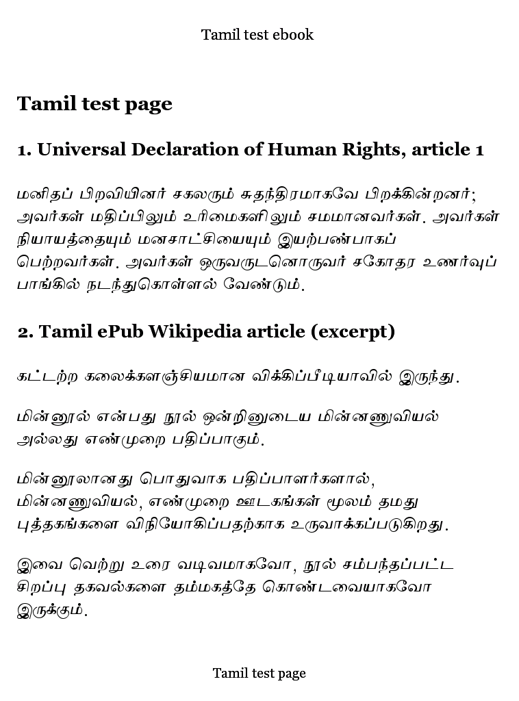 I added an epub file with an embedded Open Source Tamil font (Tamil_test_ebook_ttf_epub3.epub) that you can use to test Kobo Tamil support. AFAIK, you might have to change the file extension to "kepub.epub." |