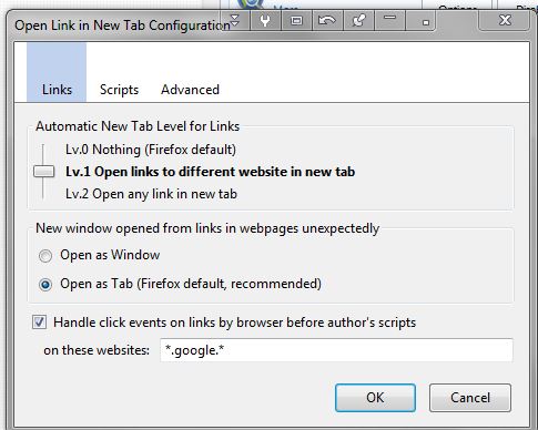 But, I do have the previously mentioned MR profile option set to All Links, don't recall ever changing it. And it seems to be the default setting anyway. And I also middle click a lot, my netbook keeps a three legged pet mouse in its pouch ![]() Try creating separate profile. You need to put firefox -p in Start Menu->Run to do that, then install the Open Link in New Tab extension in the new profile. Its quite useful to have an empty profile available for testing, investigating and evaluating extensions. Another thing to try is disable all other extensions and themes. I found a conflict by doing that only yesterday. @eschwartz - I stopped using tpm, mainly because of its performance penalty, also I'm not sure it adds much value these days. I use the Tabloc extension to lock tabs - and pin tabs is really useful. And I use the Open Bookmarks in New Tab extension. BR |