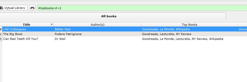I suggest you leave the content descriptors in the tags/Tags column, and create new custom column for the popularity descriptors I'll call it topbooks/TopBooks, you would define it like this: Then enter values into the Top Books column such as this: Then you can do queries such as this: And the queries can be used to create Virtual Libraries ![]() BR Last edited by BetterRed; 05-04-2015 at 05:11 AM. |