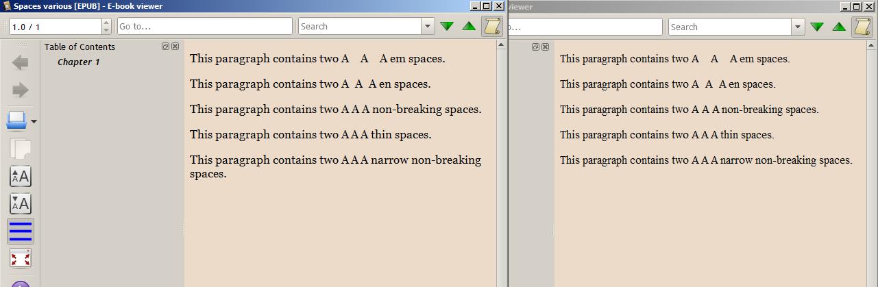 ![]() I created a simple test epub containing the various special space characters - no fancy formatting - and have no problem at all viewing them in the calibre Viewer nor on my Kobo. I tried various fonts (including Georgia and Times New Roman) in both apps and did not see the reported 'black boxes' with any of them. I did use the calibre Editor, not Sigil, to create the epub so all named entities have been translated to the relevant unicode characters. Perhaps this is why I have no problems. Here's a screenshot of the calibre Viewer using both Georgia and Times New Roman. I could post the test epub if anyone's interested. N.B. All paragraphs are left-aligned so there's no space-adjusting involved. |