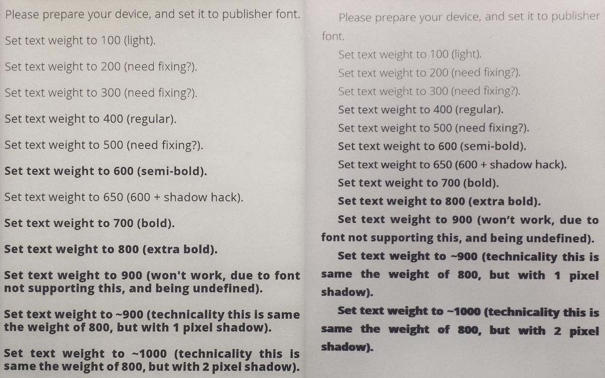 Here's a photo comparing 2 readers with this epub (although I have no idea how a shadow hack can work, seems to be totally ignored by one and reverts back to a default on the other). It was taken with overhead lights off so there wouldn't be any shadows. Which side is better? I should add that both readers had the light at 100% and tried to get the font size as close as possible, preferably so it fit on one page.