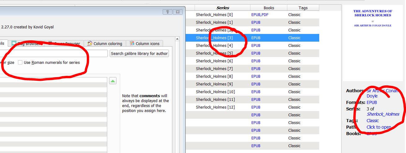 We've all been thinking you meant the Book Details panel because that's what this thread is about -- "Book detail area: series number given in Roman numerals" Lesson: this mayn't have happened had you created your own thread, rather than resurrecting an inappropriate old thread If you're not 110% sure please don't report your issues in old threads.You need to customise the book jacket template (template.xhtml) instructions are in that file (it's a one line change). Basic info about customising such things is here ==>> Overriding icons, templates, et cetera Do not edit the file in the install location - edit a copy (as per above doco) in the config folder... go to Preferences->Miscellaneous and click Open configuration directory to see where that is. BR Last edited by BetterRed; 05-10-2015 at 07:08 PM. |
