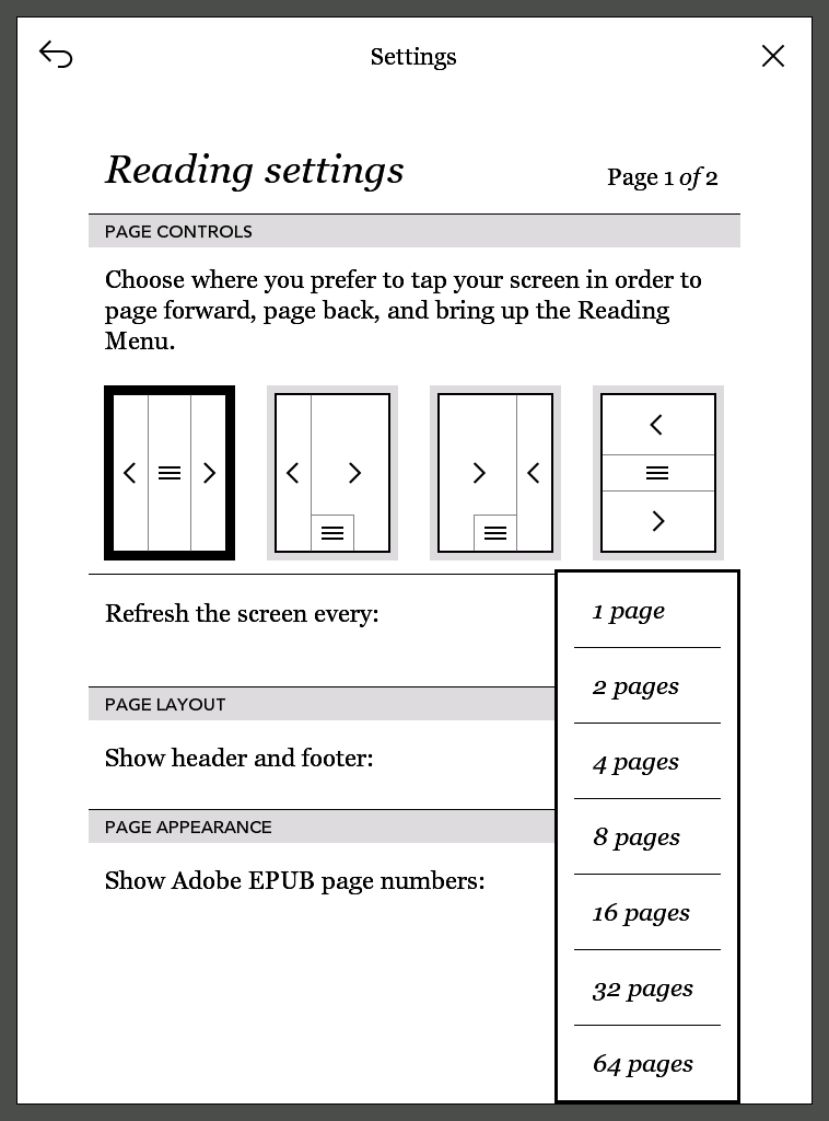 The `Custom page refresh options` patch allows the Reading Settings menu itself to be changed, so you can select from a custom set of values without the need to edit the configuration file. There are two patch alternatives: an arithmetic progression (default 1,2,3,4,5,6,7,8,9,10,11,12); or a geometric progression (default 1,2,4,8,16,32,64).
