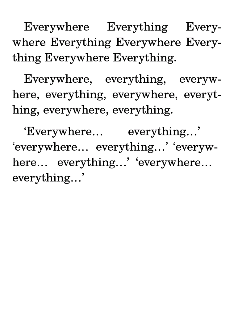 If you set the justification to the right-most button (full justification) then automatic hyphenation will be used in kepubs unless the publisher has turned it off in the book. There is a patch that will turn the justification on or off regardless of the position of the justification button, but it still won't work if the publisher has turned hyphenation off in the book. Currently the only way to get good hyphenation is either sideload the book as an epub (automatic hyphenation has long worked better in epubs than in kepubs, and with the updates to the RMSDK in firmware 3.15.0 it has improved even more), or add soft hyphenation to the kepub before sideloading. But whichever option you choose, it will depend on using good hyphenation dictionaries for the language the book is in. (Edit: I don't read sideloaded kepubs myself, so I'm just assuming soft hyphenation will work better in kepubs; but possibly the bugs in the KEPUB reader that affect automatic hyphenation could affect soft hyphenation too?) (Edit2: Attached are screenshots from my Glo with firmware 3.15.0, EPUB on the left, KEPUB on the right, showing how the KEPUB reader hyphenates in the wrong place (everyw-here, everyt-hing) when there is trailing punctuation, and fails to justify or hyphenate properly with certain non-acsii punctuation (ellipses in this case.) (Edit3: The hyphenation problem present in the second paragraph of the KEPUB screenshot has been fixed in firmware 3.16.0. The justification problem in the third paragraph remains.) Last edited by GeoffR; 06-13-2015 at 11:05 PM. Reason: KEPUB hyphenation problem fixed in firmware 3.16.0 |
