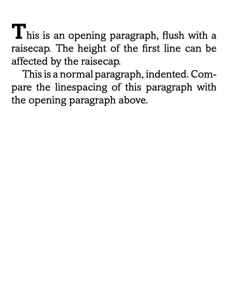 On the left is an epub with a raisecap, the raisecap span has its line-height set to zero to prevent it affecting the line spacing of the rest of the paragraph. On the right is what happens when that line-height style is removed: |