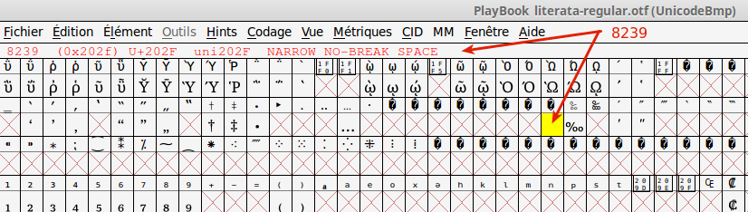 Pasting the 32 space in the 8239 box (with red cross) was just enough. No need to drag any line*. Paste, the cross disappears, the box is yellow, then generate the same font. EDIT 23/05 Dragging the vertical line, for example from 250 to 125 (Regular), reduces the nnbsp width and is indeed useful. Sorry for this mistake. Other information is still OK. Last edited by roger64; 05-23-2015 at 12:11 PM. Reason: EDIT: about vertical line |