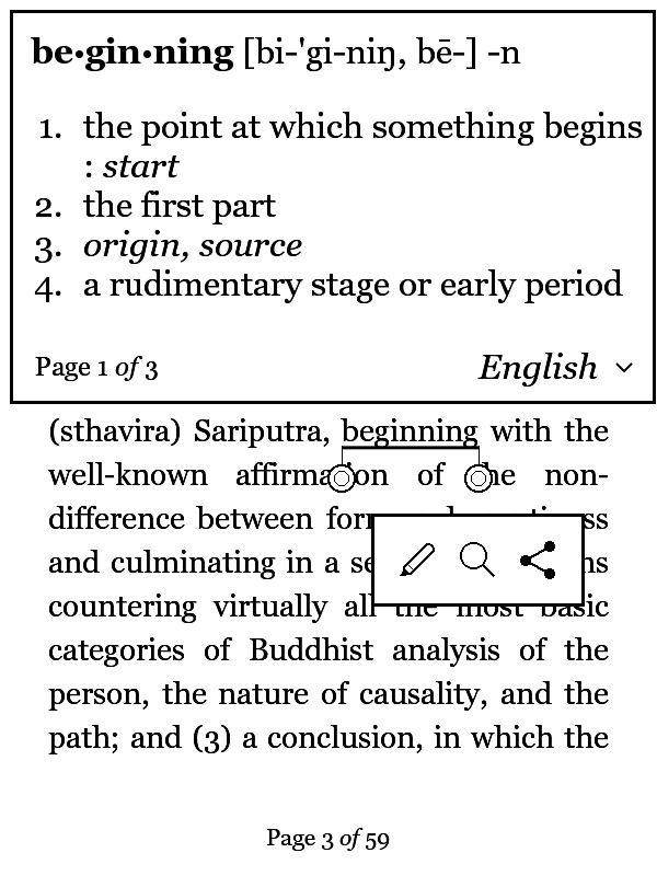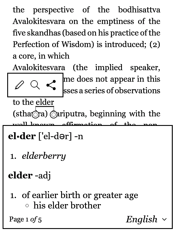 This time I changed some values for the inline dictionary panel too. Most critical are words that are located roughly halfway between top and bottom. If words in such a position are selected the selection circles, or the annotation/search/share panel tend to be hidden by the enlarged dictionary panel. If the circles are hidden, you can make them accessible by touching the annotation/search/share panel (cf. screen_002.png, screen_003.png). If the annotation/search/share panel is hidden you can make it accessible by touching the left circle (cf. screen_004.png, screen_005.png). If you need to change the height of the inline dictionary panel and its text field, look for #InlineDictionaryView in nickel.txt, and for #textEdit in libnickel.so.1.0.0.txt. I attach also the patch files in Metazoa style (mbe_3.15.0_mz-style.zip). Be aware that not all patches of the regular package are covered by them. Last edited by tshering; 05-13-2015 at 10:00 AM. |