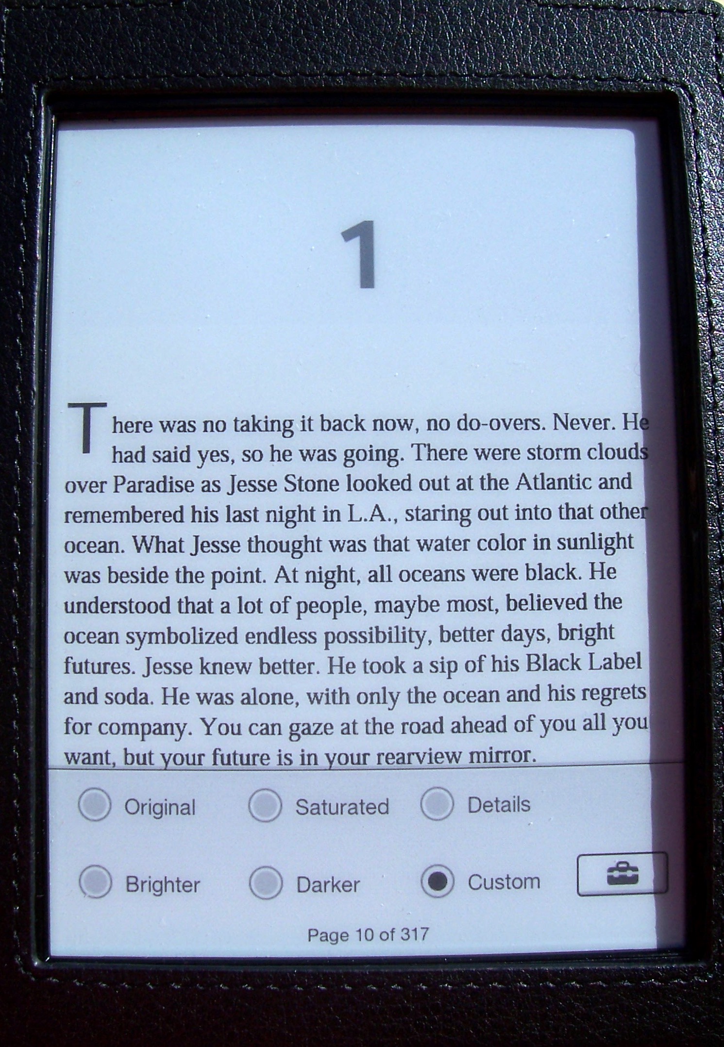 This is my first ereader, but I feel like the text in books isn't black enough. In fact the main menu seems to have blacker icons and text than the books themselves. I tested several ebooks and that seems to make no difference. I played around with the Customize View/Adjust View, didn't like the presets and set custom contrast and brightness to +64 and -64 respectively. This gives me a really dark font without any jaggies. Is it normal that for the text to be not quite black on these devices by default? I've never seen it mentioned. |