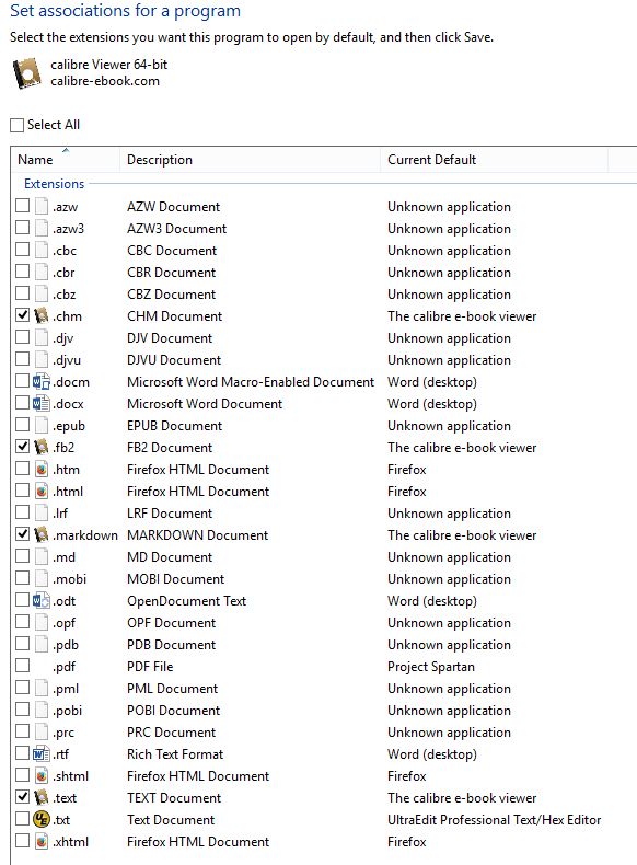 That is the key. In Windows 8 and above in control panel->default programs->choosing a program and then selecting "set this program as the default" will associate Calibre with 40 file types, which is probably what happened. Choosing Calibre Viewer would associate 30 file types. As much as I enjoy and use Calibre the "I don't care what you believe" seems harsh when obviously you understand what this feature (set default programs) does, or you wouldn't have chosen to add the entries to register the program. I've attached screenshots showing what extensions Calibre and Calibre viewers can be set to. Choosing "Set this program as default" is the equivalent of checking every box by clicking one button. It's normal to use this to restore associations that another program may have changed. While Calibre "can" open all these file types, it might be better to restrict the list to ""common" file types to avoid this issue. |