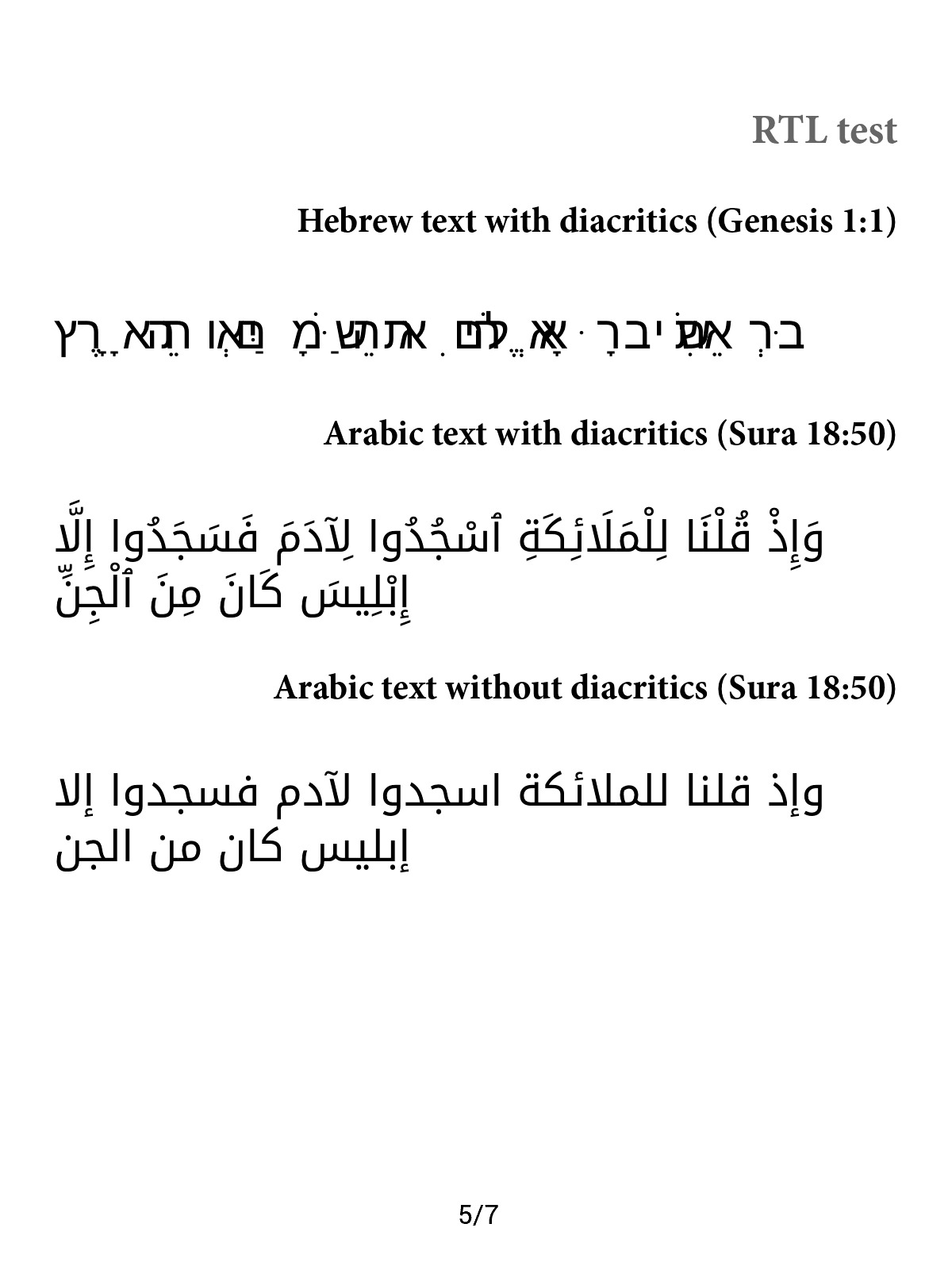 Thanks for testing the file. The Arabic text indeed looks perfect, but the Hebrew text doesn't, which is rather strange, because e-readers that support one RTL language well usually also support all other RTL languages.