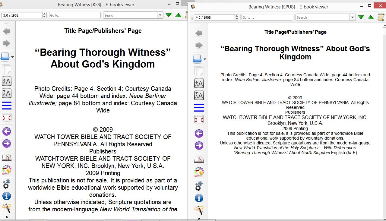 Original: <p class="st"><b>“Bearing Thorough Witness” About God’s Kingdom</b></p> p.st, .document .ct { font-family: "Arial", Helvetica, sans-serif !important; font-size: 1.25em; text-align: center; line-height: 1.1em; margin-top: 0.5em; margin-right: 0em; margin-bottom: 1.5em; margin-left: 0em; -webkit-hyphens:none; } The AZW file: <p class="st2"><a class="pcalibre1 pcalibre2 pcalibre pcalibre3 calibre5" id="page3"></a><b class="calibre4">“Bearing Thorough Witness” About God’s Kingdom</b></p> .st2 { -webkit-hyphens: none; display: block; font-family: "Arial", Helvetica, sans-serif; font-size: 1.29032em; line-height: 1.2; orphans: 2; text-align: center; widows: 2; margin: 0.36em 0 1em } The other styles don't seem to have a direct impact on the font-size in the AWZ they are just margins, bold, color etc. |