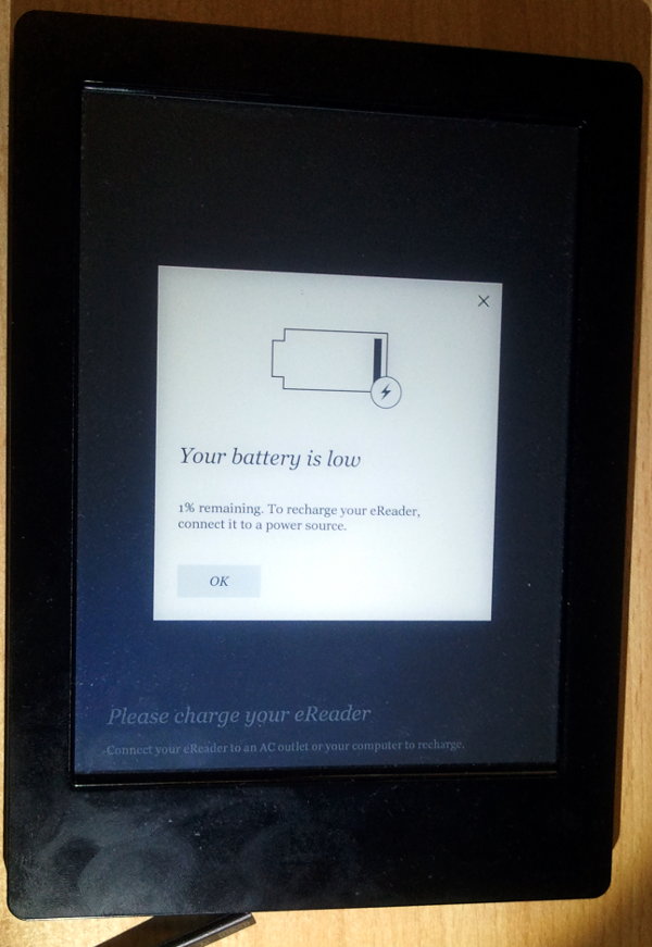 Of course, I haven't actually tried it with actually discharging the battery. I just fiddled with the values reported by the kernel driver and the black screen is how the Kobo software reacts to a fake 1% charge. I don't know if it manages to do that if the battery actually discharges naturally, because I don't let it do that. I'd rather not have to replace my battery sooner than necessary
