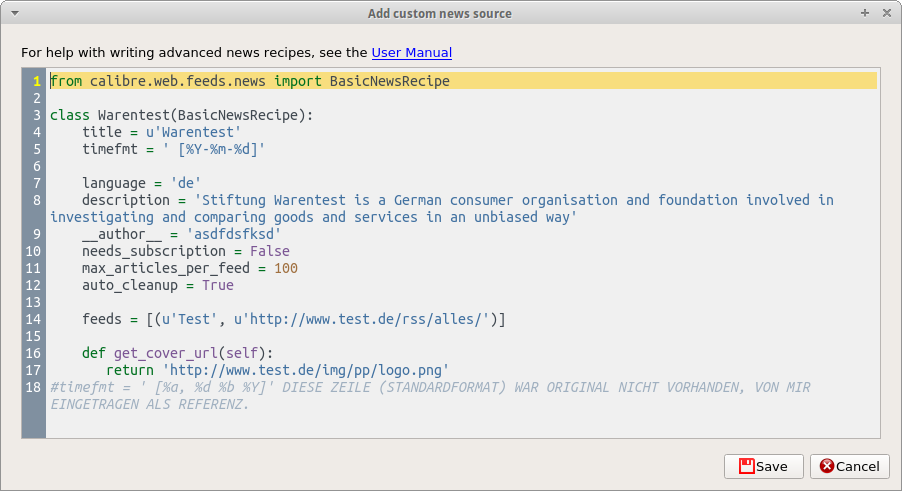 Using your recipe for me it doesn't work. Maybe I don't run the customized recipe!? But I think I do. Please have a look.Clicking Show recipe files shows me Warentest_1002.recipe from calibre.web.feeds.news import BasicNewsRecipe class Warentest(BasicNewsRecipe): title = u'Warentest' language = 'de' timefmt = ' [%Y-%m-%d]' description = 'Stiftung Warentest is a German consumer organisation and foundation involved in investigating and comparing goods and services in an unbiased way' __author__ = 'asdfdsfksd' needs_subscription = False max_articles_per_feed = 100 auto_cleanup = True feeds = [(u'Test', u'http://www.test.de/rss/alles/')] def get_cover_url(self): return 'http://www.test.de/img/pp/logo.png' My view! Last edited by chaot; 07-15-2015 at 07:39 AM. |