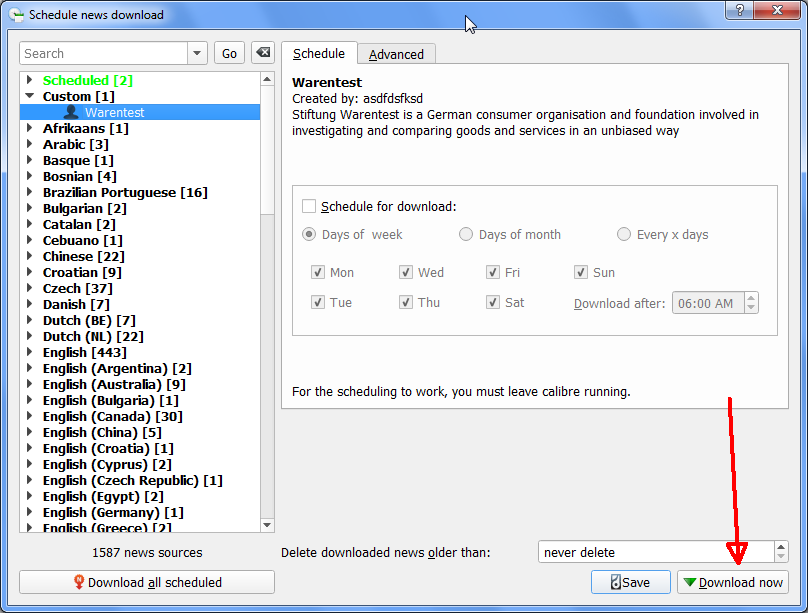 Using your recipe for me it doesn't work. Maybe I don't run the customized recipe!? But I think I do. Please have a look.Clicking Show recipe files shows me Warentest_1002.recipe from calibre.web.feeds.news import BasicNewsRecipe class Warentest(BasicNewsRecipe): title = u'Warentest' language = 'de' timefmt = ' [%Y-%m-%d]' description = 'Stiftung Warentest is a German consumer organisation and foundation involved in investigating and comparing goods and services in an unbiased way' __author__ = 'asdfdsfksd' needs_subscription = False max_articles_per_feed = 100 auto_cleanup = True feeds = [(u'Test', u'http://www.test.de/rss/alles/')] def get_cover_url(self): return 'http://www.test.de/img/pp/logo.png' My view! Last edited by chaot; 07-15-2015 at 07:39 AM. |