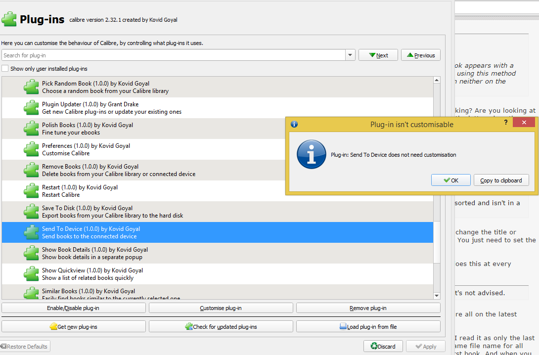For example if I right click a book>send to device(or specific format etc) the book appears with a tick next to it under 'on device' yet hasn't sent. If I then try to add another book using this method the tick moves to the new book and the previous book becomes unchecked (with neither on the device). I can drag and drop books from calibre to the device using file explorer but they don't then interface with calibre properly. They don't carry the collections data across and don't get sorted like the rest of the books into an authors file, instead staying at the bottom of the list. Finding the book and matching it to the library has no effect; the book still isn't sorted and isn't in a collection. Thinking about downgrading as previous versions worked but have read that that's not advised. |
