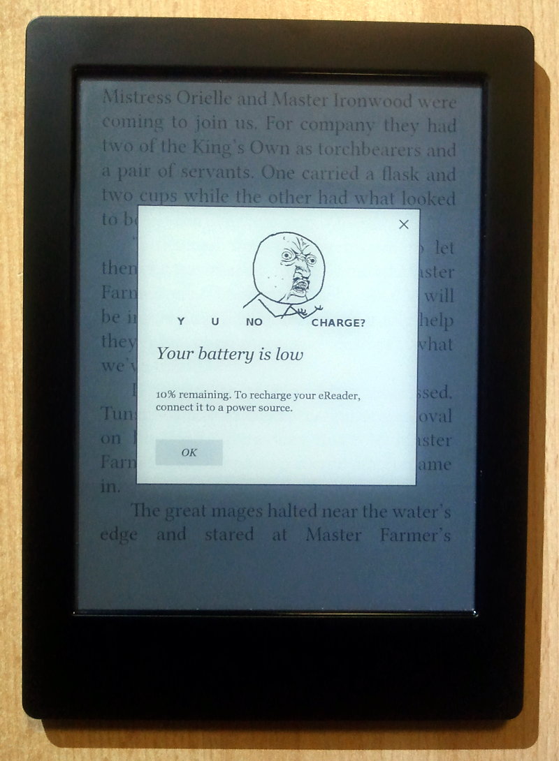 Everyone is free to use the warnings,if someone want to charge it at 20% it is perfect,modern Li-Ion have not a real memory effect. It only is wrong to warn people that they need to charge at that time or they will harm the battery,that is not true. But, I don't use wifi at all, light is at 20%, I don't use highlighting or pocket or whatever, I only read. No Sync, no rewards. The sleep modus is at 15 minutes inactivity, switch off at 30 minutes. |