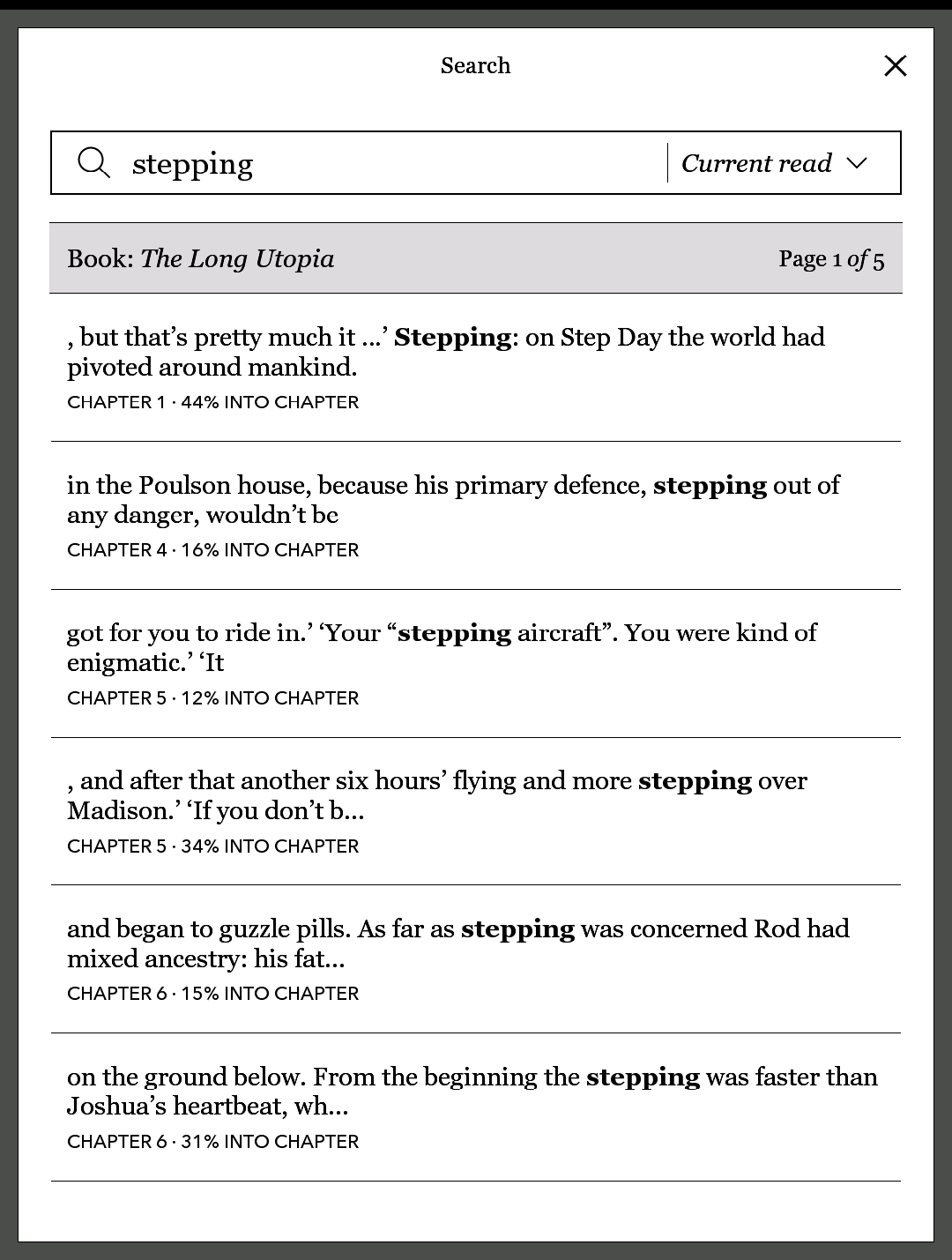 Please note that this only works when the ebook is properly formatted. There are quite a few examples where the toc.ncx is garbage or just contains a single start entry and the search result locations are GIGO. Last edited by DNSB; 07-25-2015 at 08:04 PM. |
