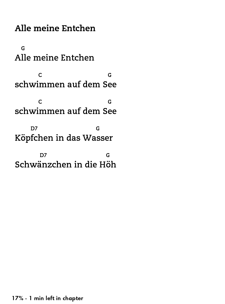 <body> <h4>Alle meine Entchen</h4> <p><ruby>Alle <rt>G</rt></ruby> meine Entchen</p> <p><ruby>schwimmen <rt>C</rt></ruby> auf dem <ruby>See <rt>G</rt></ruby></p> <p><ruby>schwimmen <rt>C</rt></ruby> auf dem <ruby>See <rt>G</rt></ruby></p> <p><ruby>Köpfchen <rt>D7</rt></ruby> in das <ruby>Wasser <rt>G</rt></ruby></p> <p><ruby>Schwänzchen <rt>D7</rt></ruby> in die <ruby>Höh <rt>G</rt></ruby></p> </body> Last edited by Doitsu; 08-11-2015 at 10:07 AM. |