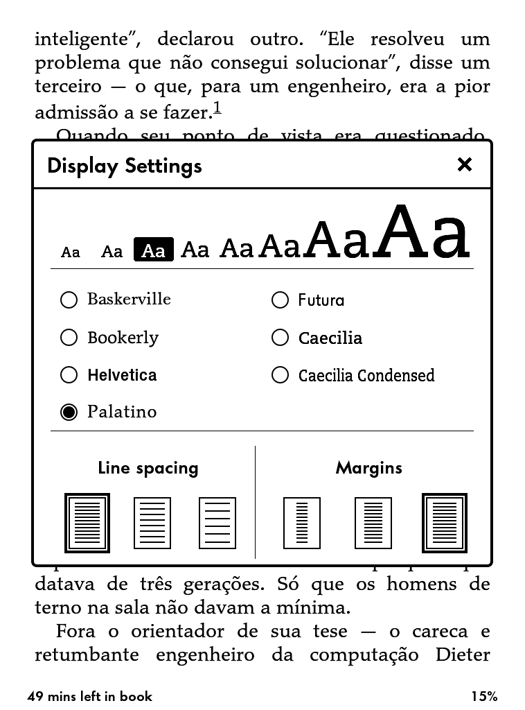 After using Palatino exclusively since it appeared on Kindles, I tried to use the new kid on the block: Bookerly. After some strangeness and accomodation, I started to like it, but, for my surprise, there is at least one problem with it. Here is the same page of the same book "rendered" with Palatino and Bookerly on my Kindle Voyage with the latest and greatest firmware. What those extra spaces are doing there? |