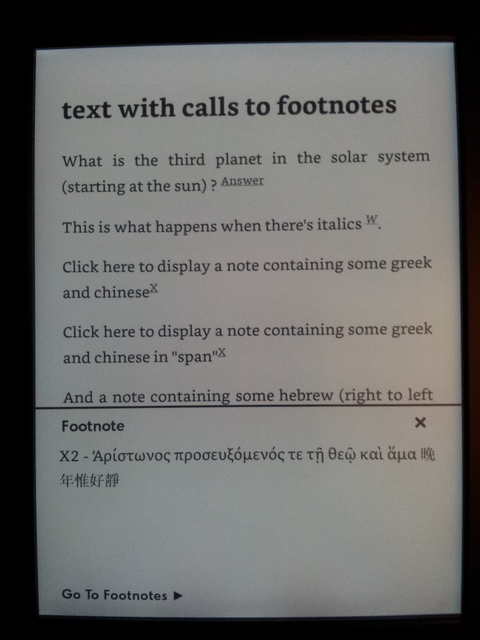 It's also quite possible that my footnote examples worked fine with Kindle files, because KindleGen most likely ignores most or all of the epub3 specific footnote attributes and the firmware only uses heuristics to detect footnote references.