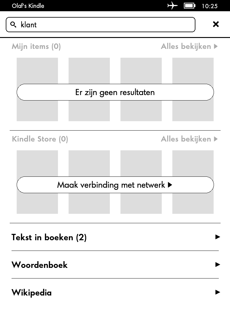 The Nederlands dictionary cannot be searched. You can select a word in a book to look it up, but not do search. Most of the dictionaries do allow a search. |