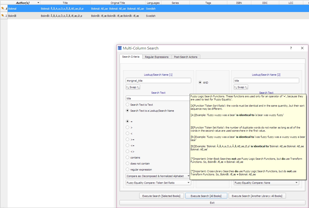 Summary: Advanced Search Tools: Inter-Book; Intra-Book; Cross-Library; Full-Text; Word-by-Book Index; Native SQL Queries; Cross-Library Duplicate Books Search; Similarity Queries; and more. Search Across Multiple Columns Interactively, Collectively and Simultaneously. Designed to provide capabilities not found in standard Calibre, such as comparing multiple columns directly, plus searching across Libraries. Performs both 'Intra-Book' and 'Inter-Book' searches. Performs additional specialized searches. Considers the text of TXT formats or the Calibre FTS indexed text as a 'virtual column', so performs 'full-text' searches of that text. Performs 'word-book index' searches. Special "Search Comments" results viewer. Cross-Library Duplicate Books Search Using Custom Columns and/or Standard Columns. Metadata Variations. Duplicate values for any Custom Column. Similarity Queries for any textual Standard and Custom Columns. Definitions, Usage, Examples, & Scope: Spoiler: