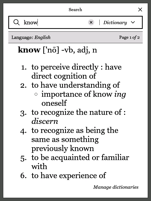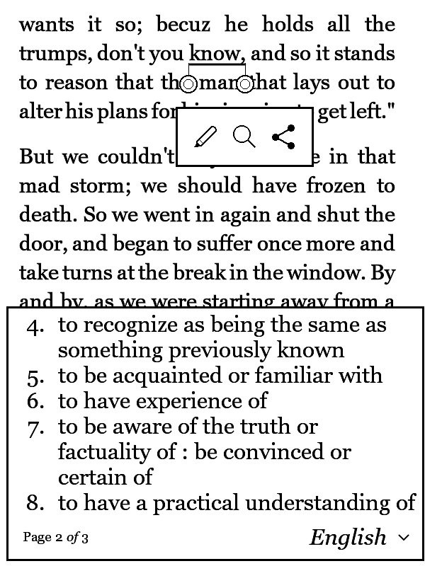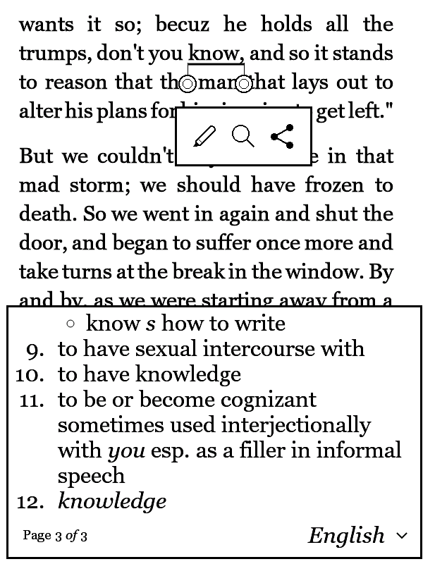 Different to previous packages, this package contains batch files specific to device models. For instance, if you want to patch for Aura HD, double click 3.18.0_aurahd_h2o.bat, and find the created KoboRoot.tgz in 3.18.0_target_aurahd_h2o. As for the values of the inline dictionary view, I tried to find nice values for Touch and Glo (they should also be acceptable for Aura). As for the other models you would have to find yourself proper values. If you can, please post them here. The concerned patches are those with position=B996F4 and position=B99E84 in libnickel.so.1.0.0.txt, and position=4B607C in nickel.txt. For reference, I uploaded screen shots of the dictionary showing the entry for "know". Pay attention that the whole text is visible (not cut on the right border or at the bottom), and that all numbers in the numbered lists are displayed. Last edited by tshering; 09-27-2015 at 08:26 PM. |