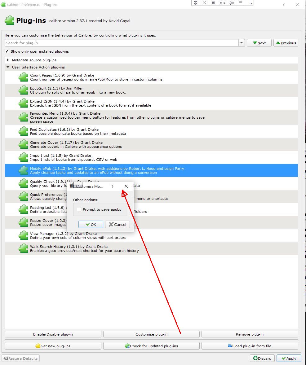 It is under calibre Preferences/Plugins/User Interface Action plugins select Modify Epub plugin and click Customize plugin (see attached for customize pop-up.) Last edited by DoctorOhh; 09-11-2015 at 01:38 AM. |