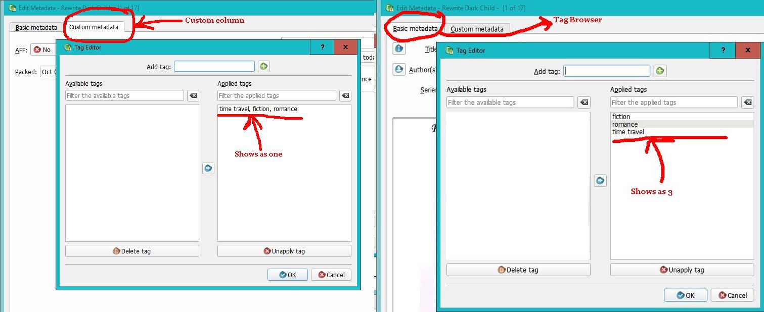 The column I created is to make shelves on my Kobo, so a book might be both Mystery and Romance, or Time Travel and Mystery, etc. When I need to enter multiple tags, I can write: - Mystery, Time Travel, Romance and three tags are created. Now that I'm using shelves, I would like the same functionality, but if I write the above, it only shows as one shelf "Mystery, Time Travel, Romance", rather than 3 separate shelves. I do try to keep them on just one shelf, but sometimes that just isn't possible. What have I missed or forgotten?? |