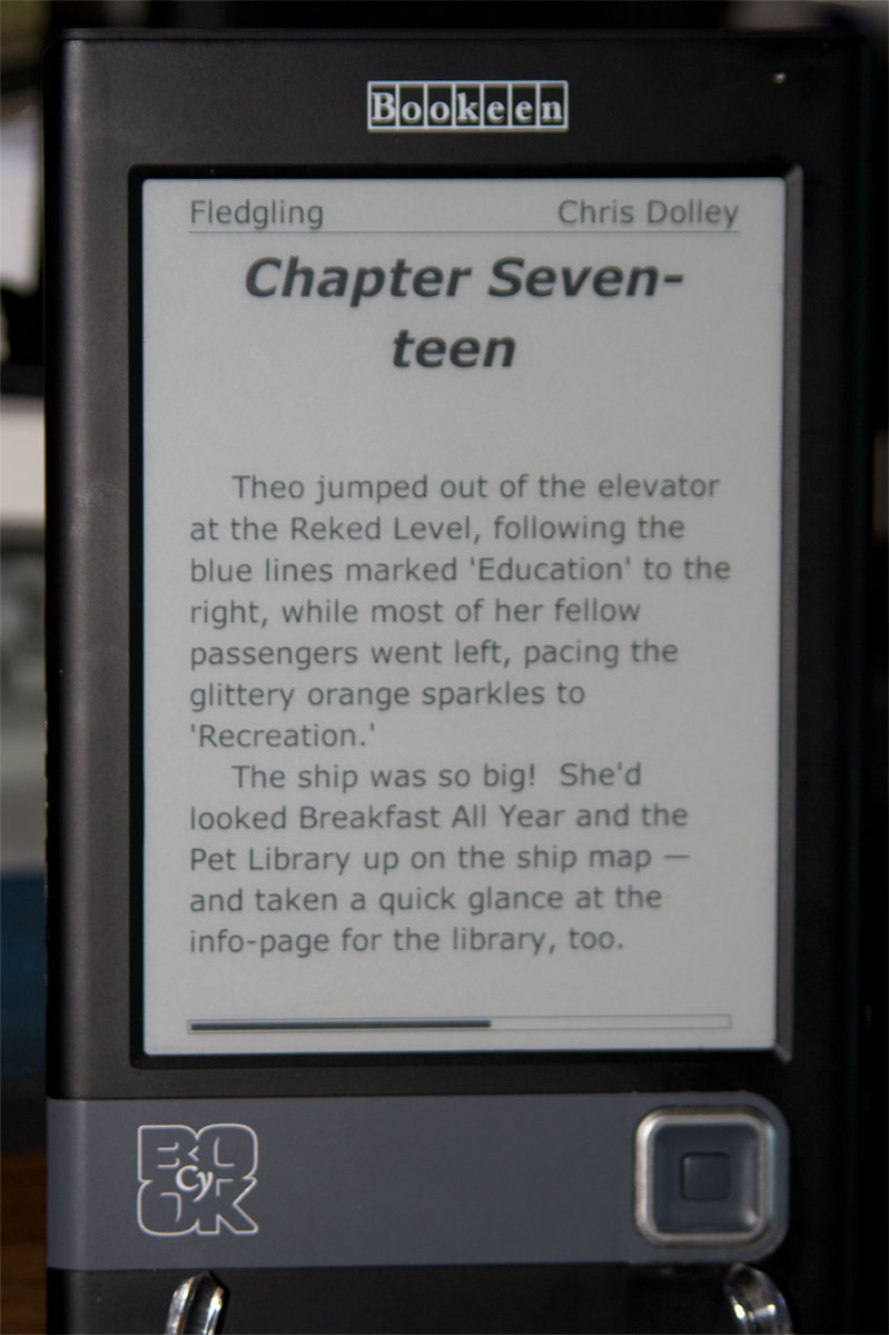 Derek P.S. The four pictures are: #1 My normal font size in Constantia #2 Same font "size" but changed to Verdana #3 Verdana font again but upped by one font size #4 Now same size but changed to GaramondNo8 Notice how the text flow changes to fit the new font family/size. This is why hard-coded line and page breaks are not a 'good thing' under Mobi. P.P.S. The ebook, "Fledgling" is by Steve Miller and Sharon Lee, but Francis Turner and Chris Dolley have taken - with M&L's permission - the weekly chapter posts of the (very) rough draft and bundled them into .mobi files. Unfortunately, I've not yet taken this ebook apart and re-formatted it to show the proper author names. Last edited by delphidb96; 12-31-2008 at 07:39 PM. Reason: added pics |
