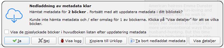 As you say, I'm doing ctrl+D and then alt+B to download in bulk and I get a different message than you. I used to get your message before I upgraded to windows 10 and reinstalled Calibre. My message is in Swedish... but a rough translation is: download of metadata is completed downloaded metadata for 5 books. continue to update metadata in your library? could not download metadata and/or cover for 28 of your books. click on "show details" to see which. and the buttons are: yes -- no -- show log -- copy to capture tool -- remove downloaded metadata -- show details |