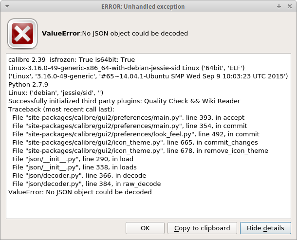 Have looked at the various pretty new icon themes today. What we see in calibre main view should be Black Edition, I guess. If I want to change that, comes this error message ValueError Both calibre and the laptop were repeatedly reloaded. Last edited by chaot; 09-29-2015 at 01:40 PM. |