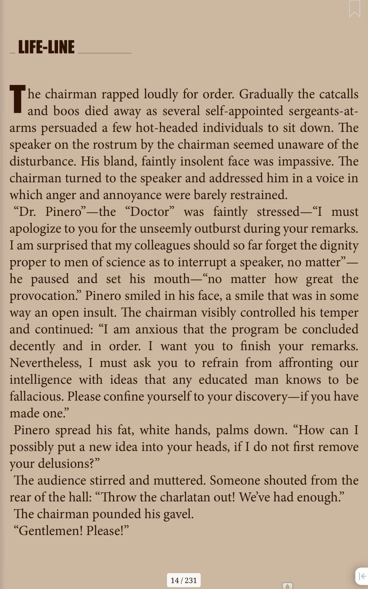 I didn't see any at first, and had to study it a bit to notice them. I think paragraph indents should be large enough to help the eye 'catch' the start of the next paragraph easily. This shallow an indent wouldn't do me any good if I got into the book and got to 'seeing' the video in my head of the action and not the actual words. I'd keep tripping up on one long paragraph with this shallow an indent. I'd rather have a line space between paragraphs than that. But it is there. If just barely. |