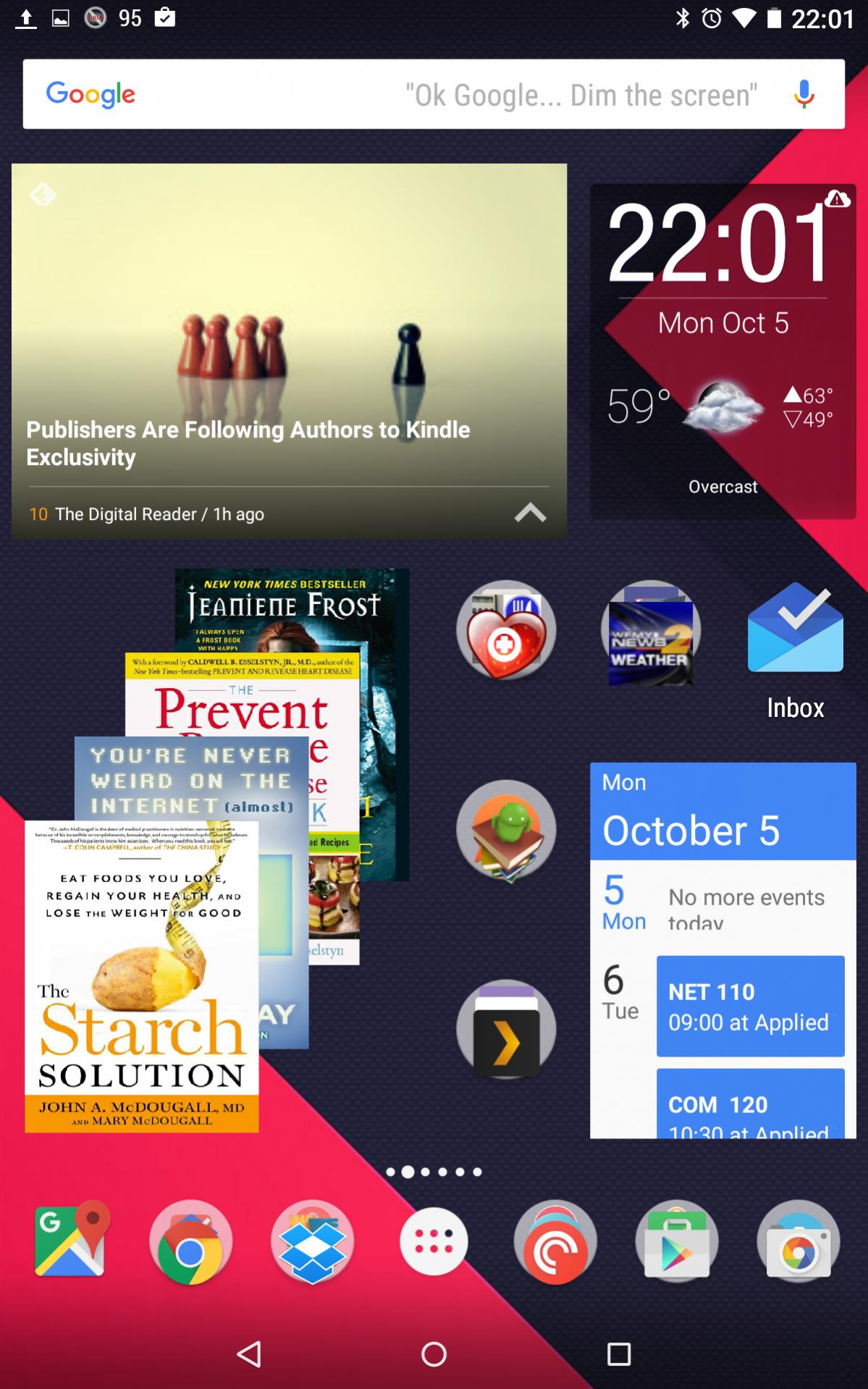 Good point, I guess I could devote one of the screens just to the books I'm reading, but I can do that on the book shelves of the ereader. I'm one of those odd ducks that read (non-research) probably 10 books at a time, of different categories - biography, sf, fantasy, etc, depending on my mood.