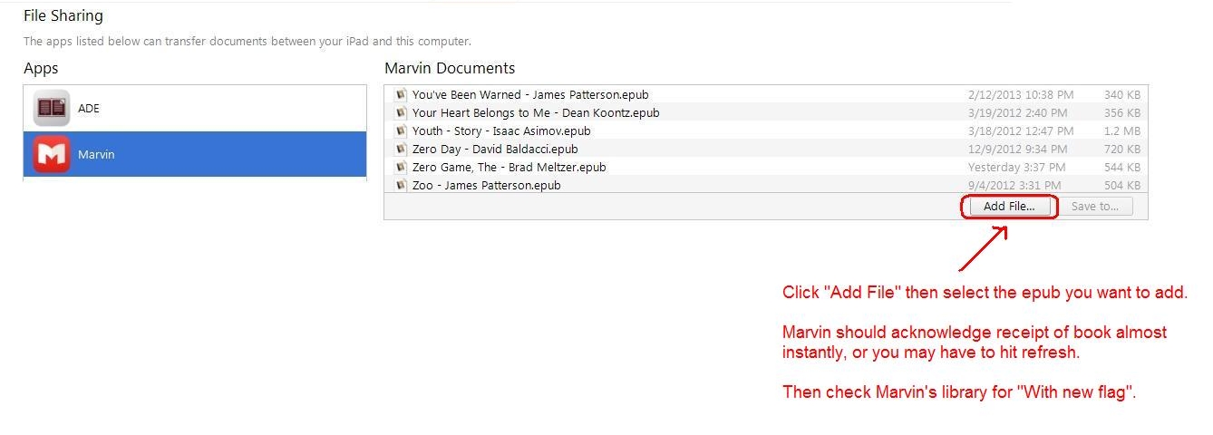 I have updated to 12.1.3 4-bit for Windows. Connected the ipad (iOS9). Found the 'Apps that can be used to transfer files. Gone to Marvin it still shows exactly what it did in the old set up: my books show in the "Marvin documents" pane on my PC's iTunes/Marvin window as if all is well. But on Marvin on iPad itself I see only the 5 books that came originally bundled with Marvin. It is an ipad 2 could that be the problem?