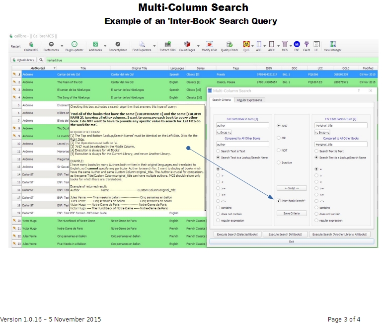 There is already a way to easily correlate different languages of the same book to each other without developing a new plugin for that sole purpose. [1] Install the 'Multi-Column Search' plugin. [2] Install the 'View Manager' plugin. [3] Create a custom column named '#original_title'. [4] Populate '#original_title' with the original title used by the Author. In your example, it would be 'Airframe', and each of your 3 books would then have 'Airframe' as their '#original_title', with only the English version having a Title of 'Airframe'. The others would obviously be the translated names based on their languages. [5] Customize 'View Manager' to include '#original_title', and change the sort to be: Author; '#original_title'; Title. [6] Create a custom column named '#translation_group'. [7] Using the 'Multi-Column Search' plugin as described in Page 4 of its User Guide, and which is attached below, search using an Inter-Book Query. [8] For each 'group' returned in the Search Results, add whatever value you would like in the '#translation_group' custom column. [9] Create a Virtual Library with the stated criterion of: '#translation_group:True' [10] Whenever you want to only look at books for which you have multiple languages, invoke that Virtual Library. DaltonST Last edited by DaltonST; 11-06-2015 at 10:52 AM. |