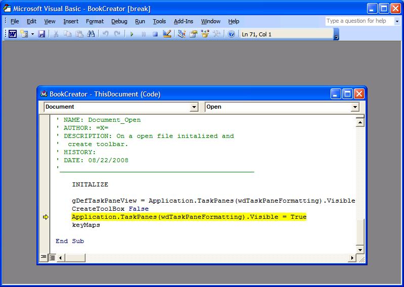 BookCreator's book been wonderful, but I had a few bugs with it this morning (screenshots attached). I used the Import tool to grab the files, used buttons and the auto-chapter identifier to change styles, saved, and then had the error upon trying to create the LRF. Apart from the error message, there was the temporarily-created html file created and open in another Word window. (Word 2003)
