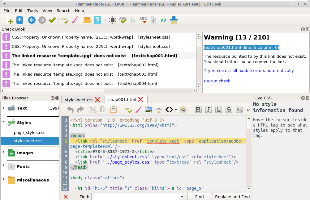A book got multiple warnings which are all not to correct automatically (via ''Try to correct all fixable errors automatically'', a dozen WARNING: CSS_Property_Unknown Property name. (xxx_x_word-wrap) (stylesheet.css) Description: This CSS construct is not recognized. That means that it most likely will not work on reader devices. Consider replacing it with something else. With what to replace? Can't I delete all these lines showing word-wrap: break-word? and about 200 WARNING: The linked resource template.xpgt does not exist (text_chapxxx.html) Description: The resource pointed to by this link does not exist. You should either fix, or remove the link. I don't know how to fix, but I may remove these links. Yep! The general problem is the sheer mass of warnings. Exist a possibility to correct in bulk? Last edited by chaot; 10-22-2015 at 12:22 PM. Reason: Solution states→Description |