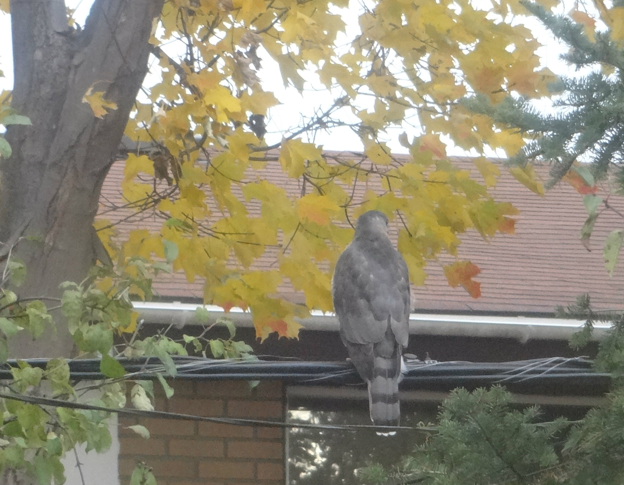 I don't know what kind of raptor it was. It was the right size for a peregrine falcon, and my house is 5 km from an active Peregrine nesting site. I did manage to get a few pictures - very low quality since I was using a simple camera and shooting through the window, as I didn't want to disturb the bird. |