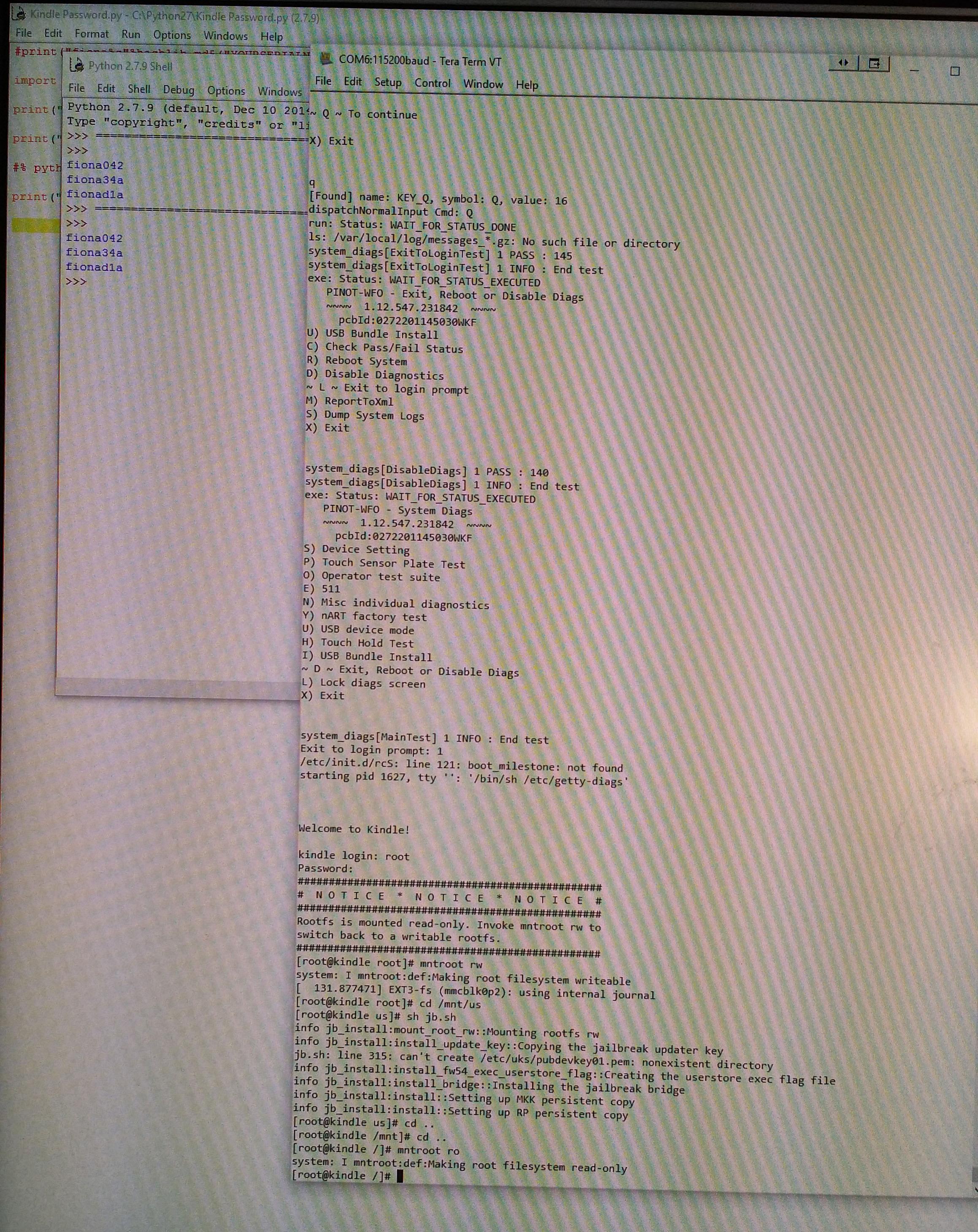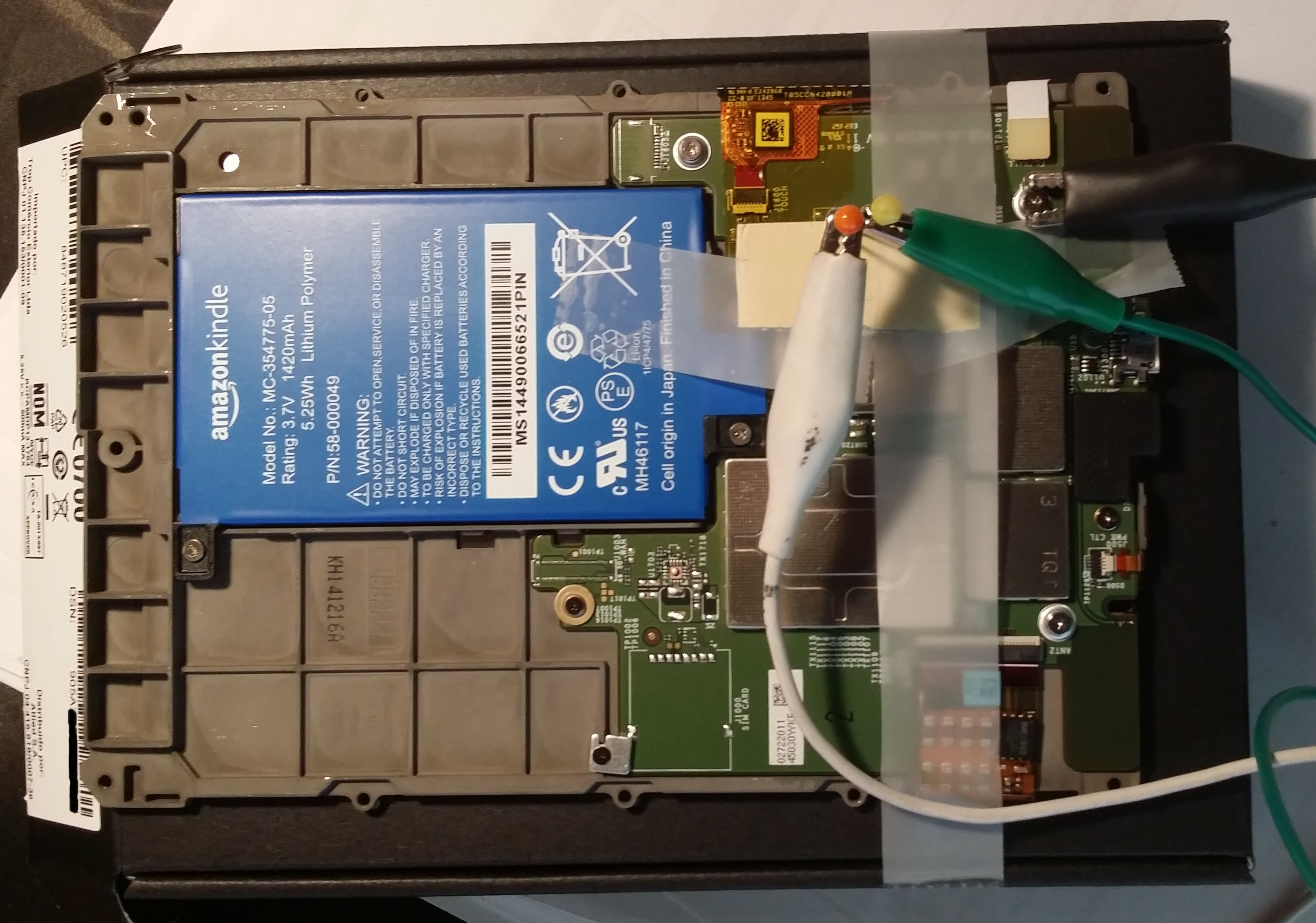 I have several PW2s so I was keen to get on with it. First up, opening the PW2 is a lot easier than I thought it would be. The plastic bezel which has to be lifted is very tough and flexible and there is little to no chance of breaking it. The biggest risk is to damage the screen but with a bit of care and by going slowly that risk is fairly small also. I read elsewhere on this forum that using a heat gun or hair dryer makes it easier and that is certainly my experience. It also makes reassembly easier to heat the kindle and the bezel (and hence the residual glue) before snapping the bezel back in place. After doing the first PW2 I found it easier to lift the bezel by doing the top edge last. This is because there is some pretty tough double sided sticky tape under the top edge and it is easier to work the bezel free by lifting it evenly across the full width. Anyway, there is a fairly high chance that the tape might tear a little but it is not a problem for reassembly. The rest is straightforward. I used a TTL-232RG-VREG1V8-WE usb to serial cable with an ftdi chip in it. The cable has six open tinned wires on the serial end. For the first PW2 I soldered wires to the serial pads. I have got a really good temperature controlled fine tip soldering iron and a decent desk top magnifying glass but because I am left handed and the pads are hard up against a metal cover I found it very difficult to do the soldering. With some perseverance I did succeed and by connecting ground, tx, and rx only (no other voltage connections required) I succeeded in getting the jailbreak installed. I have a windows 10 pc and I was running Teraterm as the serial program interface. The TTL-232RG installed automatically and Teraterm found it on a usb com port ok. However, when I first connected the usb to serial cable and set Teraterm to 115200 I was getting immediate key responses but it was gibberish. It took a couple of 15 second reboots to get the PW2 and Teraterm to sync properly. This was probably a timing error on my part but eventually the link settled down and was flawless. I also found that I had to be really quick after a reboot to hit an enter key to get into uboot. Back to the point of this post. I wasn't looking forward to wrestling with the soldering iron for my other PW2s so having realised I only needed two 'difficult' connections for tx and rx (earth connections are available in many places - eg, on metal covers, on screws, and solder pads) and that I only needed those connections for a couple of minutes I devised a simpler method which was OK for a temporary connection - see photos. I simply sticky taped a piece of high density foam to the top of a cover next to the serial port pads and used the foam to support two sewing pins that are pushed through the foam and down onto the tx and rx pads. The big breakthrough was that when I raided my wife's sewing box I found both an orange and a yellow pin which happen to be the wire colours for rx and tx on the usb to serial cable! The pins push into the solder enough to make the connections more than good enough to do the job. It takes only a few minutes to get the jailbreak installed (note: the jailbreak was preloaded via the normal usb connection and the password was pre-caclulated using: print("fiona%s"%hashlib.md5("905A22014516049H\n".e ncode('utf-8')).hexdigest()[13:16]) on an IDLE platform. I don't know if it is a feature of the TTL-232RG cable or not but it helped only having to use three wires. The earth was easy as it was just clipped onto a screw head as in the photo. So it comes down to just getting two connections in place and that turns out to be very easy also. I hope this helps someone else get the job done. |