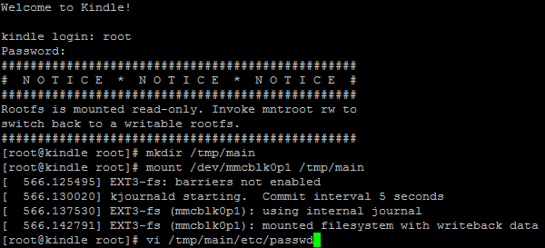mkdir /tmp/main mount /dev/mmcblk0p1 /tmp/main vi /tmp/main/etc/passwd The Vi program will load and put the password file on the screen Use the arrow keys to move the cursor over the "x" (it might be a "!" instead) which is right after "root:". Press "x" to delete the x Hint: The "delete" key doesn't actually delete characters in this program. Just roll with it. The file now looks like this Removing the "x" is telling the system that the main root account doesn't need a password. Type ":w" to save the file & exit the editor The text editor will close, but the file will still appear on the screen. Don't be afraid of that, it's ok. Type "reboot" to restart the kindle 3. Run the jailbreak Now we get to the meat of the matter! Let's make it rain! Wait for your kindle to finish booting. It will appear as a storage device on your computer. Copy all of the files from the jailbreak .ZIP to the base directory on the kindle "Eject" the kindle from your computer and unplug it. Warning: Leave the USB serial converter plugged in! In your putty window, press "Enter" This will display the login prompt Type root to log in Type these 2 commands: Code: