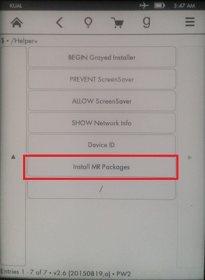 We will put some basics onto your kindle now that it's been uncaged 1. Install KUAL KUAL provides a GUI to manage other programs on your kindle Copy the "azw2" file from the KUAL zip to the "Documents" directory of your kindle Eject the kindle from your computer "Restart" your kindle from the screen menu When your kindle is restarted, you will see the "Kindle Launcher" is now available 2. Install KUAL Helper This helps KUAL be better than ever. (I think it lets your goodies appear in the KUAL menus) Connect your kindle to your computer Copy the "Helper" directory from the KUAL Helper zip into the "Extensions" directory on your kindle Eject the kindle from your computer "Restart" your kindle from the screen menu Hint: I am not certain that ejecting & restarting the kindle is necessary, but I do it anyways 3. Install KUAL MRInstaller This is an add-on for KUAL that allows add-on packages to be installed very easily. I think it needs KUAL helper which is why we are doing it 3rd Copy the 2 directories from the MRInstaller zip to the root of your kindle. This means a new directory called "MRInstaller" will be created inside extensions, and another directory called "mrpackages" will be created in the root" 4. Install Screensaver hack This will let you change which screensavers appear when your kindle is sleeping. Perfect to show your spouse, children, pets, or cars that they super special to you! Copy the .bin file from the Screensaver Hack .ZIP to the "mrpackages" directory on your kindle Eject the kindle & unplug it Open the "Kindle Launcher" (KUAL) book on your kindle Select "Helper+" menu option Select "Install MR Packages" menu option The MR Installer program will do some stuff and will tell you when it's done Reconnect the Kindle to your computer Upload the pictures you want to be your screensavers into the "\linkss\screensavers" directory on your kindle Hint: On the Paperwhite 2, the pictures should be '.png' format, 758x1024 size, in greyscale Hint: You can use a website like resize.it to convert your pictures to the best kindle format. Hint: You can upload any filenames you want, but the hack will automatically rename your pictures when you reboot. Eject and restart your kindle When your kindle restarts, press the power button to activate your screensaver Congratulations! You used a hack only available to jailbroken kindles!