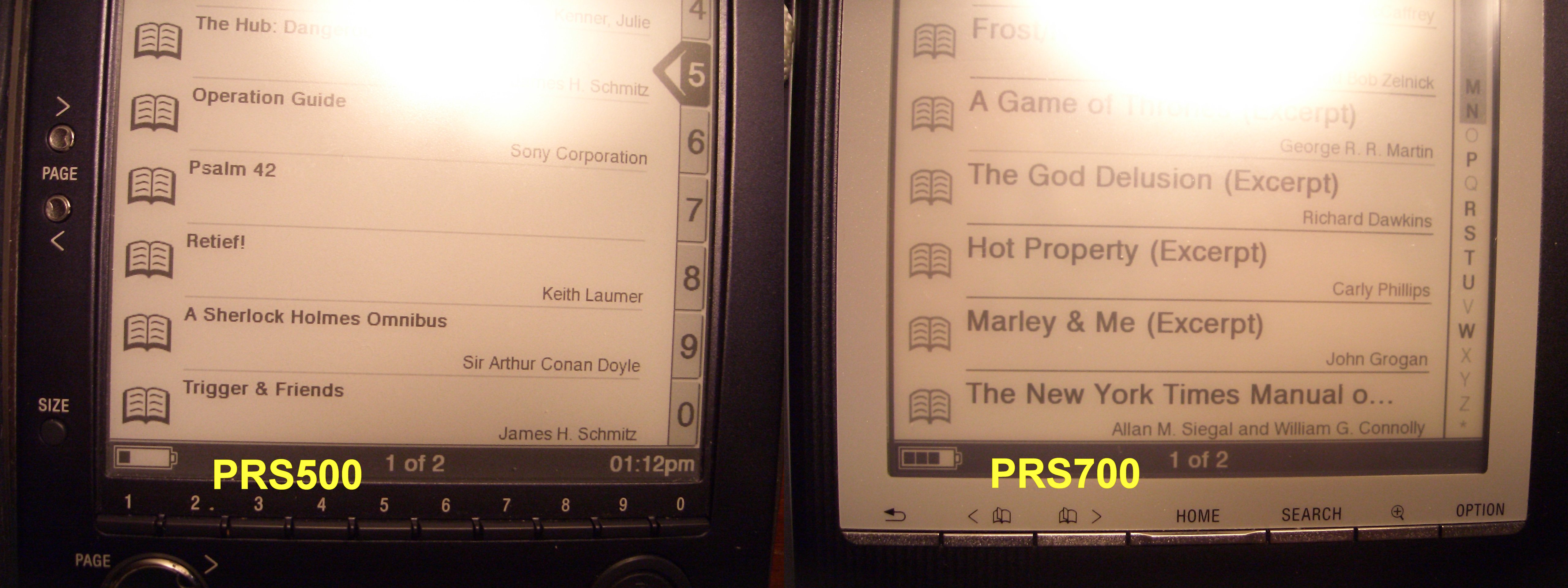 ![]() Two Weeks With The PRS700 Once again, the Sony Reader Marketing team has kindly, and generously allowed one of your MobileRead Editors the opportunity to examine and review their latest offering in the PRS line. From the PRS500, through the PRS505, and now the PRS700. Two weeks ago, when the review unit arrived, I transferred my current reading list over to it, and set aside my trusty PRS500. I figured that at this stage, when others have given the PRS700 a thorough treatment as far as specifications and basic operation go, the best "review" I can offer you is a hands-on "road test," so to speak, and the best way to do that was to commit to using the 700 for as much of that time as I could. Naturally, I will touch upon some hardware and software specific points, but within a context of how they affect the reading experience on the new device -- you already know the facts and figures, I'd like to try to convey what it's like to use a PRS700. Which means that the Reading experience is probably a good place to begin. In normal reading conditions, by that I mean without the front light turned on, I found the display on the 700 to actually have less contrast and clarity than that of the 500 (if it needs to be said: keep in mind that the 505's display is more contrasty and clear than the 500's). Just like all e-ink, the contrastiness and clarity improve with brighter lighting conditions. (I've attached some comparison pictures to illustrate the contrast and clarity differences. In taking the pictures I tried as much as possible to photograph both the 500 and the 700 in as close to exactly the same lighting, position, angle, distance and so on, as I could pull off -- I don't consider them identical, but they're pretty close.) My impression of the contrast differences is much the same as that of others who have commented on the lower clarity: it seems to result from a combination of the touch-screen membrane, and the plastic involved in the front light. Just like everything else in the world, there's a trade-off for those feature set increases, in this case, it's a decrease in "regular lighting" readability. For all that, I found that after a couple of days, I didn't notice it much any more, and the overall readability is still quite good. The other aspect (visually speaking) of the display that I'd like to remark on is that it is rather more prone to glare and reflections than the 500 or 505. It's the front light, again: in order to be read through, it has to be pretty transparent, which means more reflective. You can see in the third attached picture that there are some reflections on the display of the 700 that aren't there at all in the 500. Again, these were taken in more or less the same physical position beside a window, with the camera, photographer, and all lighting unmoved between them, and only a few tens of seconds time-space apart. The glare and reflectance are more noticeable on the 700 than the 500. What this means in practical terms is that the reader (the person, that is) spends a bit more effort finding an angle where the display is free enough of glare and reflections to read from. In the interest of full disclosure, and being as accurate and informative as possible, I should acknowledge that I am a person who's rather sensitive to glare, so that you can consider that factor as well. Something I'm not particularly bothered by, however, is fingerprints. Sure if they're really bad they bother me, but I'm not a fanatic about it. That being said, the touchscreen on the 700 does show some fingerprinting. This can mostly be seen when catching light on the display. I am in the habit of not handling electronics (especially other people's electronics) unless my hands are fairly clean, but I still see streaking and printing on the screen when I turn it to a light. Regarding the touch screen operation, and the display operation, since it's hard to really separate the two, I was most pleased. The response of the display refresh is very snappy, noticably faster than even a 505's refresh. The "swipe and hold" motion for rapidly skipping through pages is as fast as could be hoped, not quite too fast to follow with the naked eye. It's really surprising to see e-ink responding so quickly! I used this feature some for navigating Bible chapters, and it worked like a charm. The touch-screen selection of links greatly improved this operation as well, allowing me to reach a particular passage in a few seconds (as fast or faster than I could with paper) where it was a minute or longer operation on the 500. I can see this feature being useful for reference works such as a straight dictionary: links to the start (and maybe middle) of letters, and then skip through to find the page. Most pleasing. The regular page turning was interesting, if not quite as straightforward. I should comment here about the touchscreen itself. While it will respond to a fingertip, it really responds best to something small and hard, such as the included stylus (which I didn't find a need for, very much) or the tip of a fingernail (which I used a lot). What that means is that when using a fingertip, a firmer pressure was required, and a longer duration touch, to make the command register. Not much pressure, you understand, just more. I did find myself mostly using the hard-buttons to change pages when reading one-handed: when sitting up, the "swipe" worked great, but the buttons seemed to be more convenient for me when lying down, and certainly when doing something else with the other hand. The menu system is a marked improvement over the 500/505 menus, mostly thanks to the touchscreen control. Navigating between books was simple and straightforward, I even found myself accessing the settings menu to check the time (no in-book time display in the loaner unit, of course), it was so easy to navigate that I mostly did it without thinking about it, once it occurred to me that I could. Also related to general navigation, I 