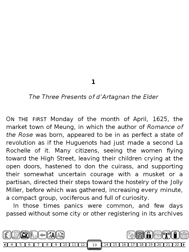 The last scan is from OpenInkPot (FBReader based), it does not honor the CSS for a chapter start, and the text starts with all caps. In OpenInkPot the TOC works either via following links from the in-lined TOC or by bringing up the TOC menu item and selecting the chapter from a list. This is the same behavior you see with Desktop FBReader. |