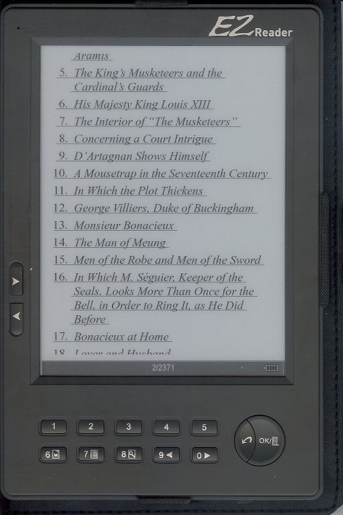 The last scan is from OpenInkPot (FBReader based), it does not honor the CSS for a chapter start, and the text starts with all caps. In OpenInkPot the TOC works either via following links from the in-lined TOC or by bringing up the TOC menu item and selecting the chapter from a list. This is the same behavior you see with Desktop FBReader. |